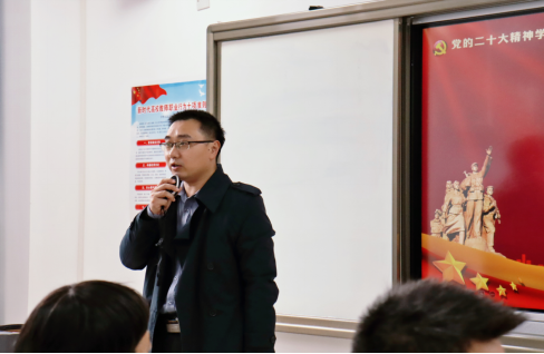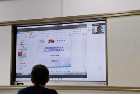 第一项由今年会jinnianhui官网党委书记汪再奇进行致辞(如图三)。汪再奇书记指出需仔细研读二十大报告和十九届六中全会报告,将二者结合起来,要认真学习,常学常新。希望各位老师和同学们从中有所收获,加强凝心铸魂党性修养,不断提升自身理论修养,同时也希望各个支部能多交流多沟通,共研共学。