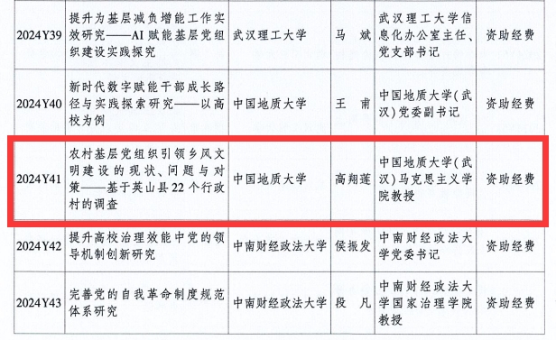 (通讯员:陈越)近日,中共湖北省委党的建设工作领导小组办公室、湖北省党的建设研究会发布《关于2024年度湖北省党的建设研究课题立项情况及有关事项的通知》,今年会官网高翔莲教授主持申报的《农村基层党组织引领乡风文明建设的现状、间题与对策——基于英山县22个行政村的调查》成功获批专项课题立项。