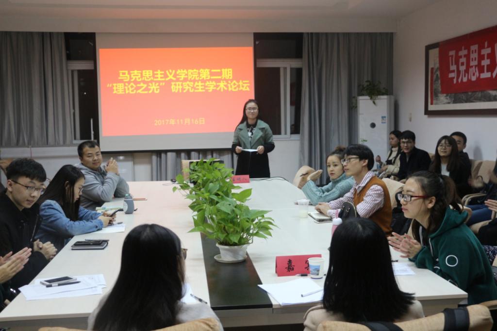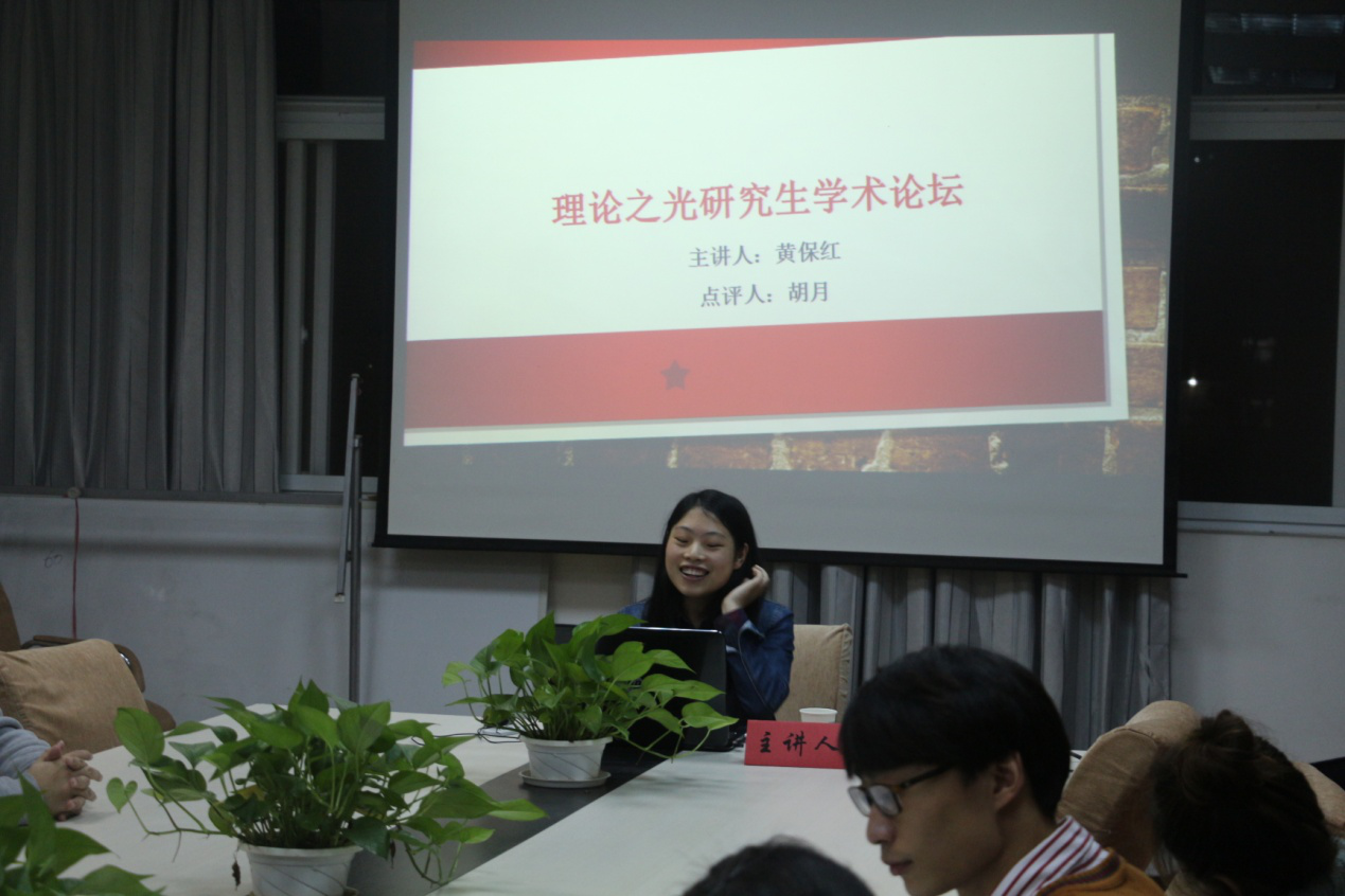 2017年11月16日晚七点,今年会jinnianhui官网第二期“理论之光”研究生学术论坛如期举行。今年会jinnianhui官网2015级硕士研究生杨静、黄保红作为本期论坛的主讲人,卢微、胡月担任本期论坛的特邀嘉宾。