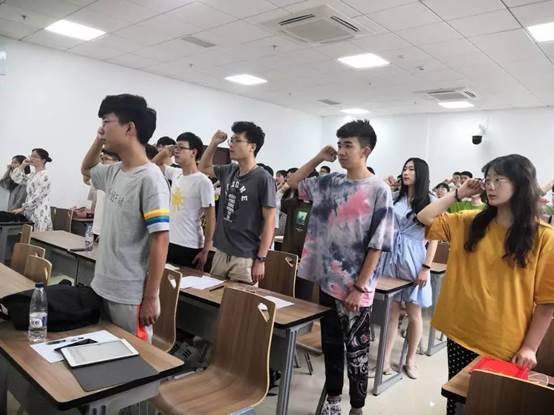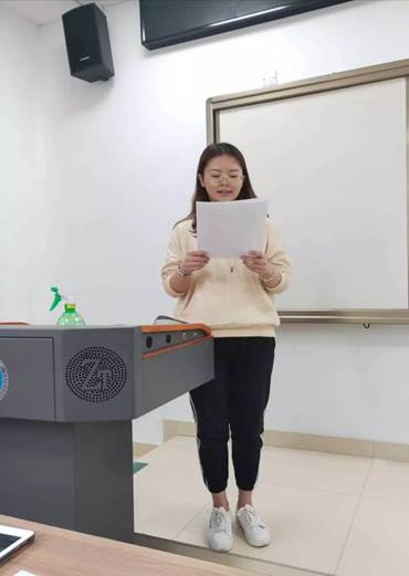 在共同观看视频《共青团公开课•团的光辉历史》后,党员胡梦婷、181161团支部成员赵慧、181171团支部成员赵舒雅,先后为大家介绍了五四青年节的意义、“五四运动在武汉”、习近平总书记在纪念五四运动100周年大会上重要讲话精神等相关内容。接着,181181团支部成员吴思远、蔡安禧、刘王飞、董乐带来了朗诵《五四的火焰》。团课的最后,全体与会同学用“新青年耀青春”宣誓接力的形式为本期团课画上了圆满的句号。