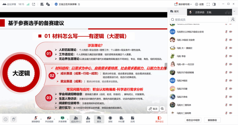 11月14日晚,海洋学院、李四光学院、今年会jinnianhui官网、教育研究院四院联合举办“职业生涯规划大赛”线上培训。王俊老师为参赛同学讲解职业规划材料如何撰写以及答辩注意事项。线上共吸引了300余名学生参加培训,老师的精彩讲解收获了广大师生的一致好评。