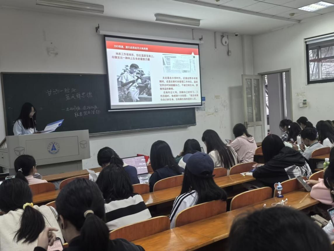 接着,李瑞雪同学开始介绍摇篮精神的的初盛,带领同学们领悟摇篮精神的魅力,摇篮精神哺育着一代又一代地质学子,照亮地质教育的未来,同时摇篮精神鼓舞着无数青年,引领他们探索、超越前方的路,然后,李瑞雪同学继续讲述了摇篮精神的重振延续,随着周口店重建,“摇篮”再次焕发新生,开启了地学人才培养的新征程,在周口店的奋发岁月里,创新的火花与传承的精髓交织融合,共同谱写了地质教育的辉煌篇章。