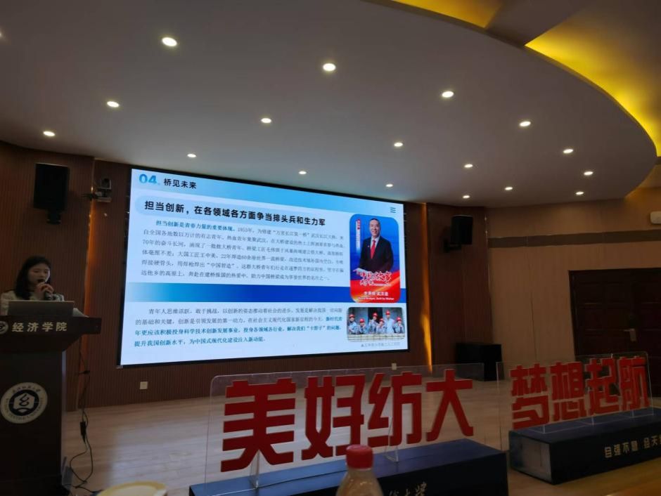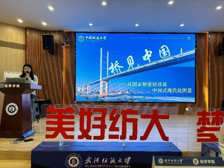 桥梁建设如同国家发展的缩影,见证了新中国从无到有、从有到优的辉煌历史。桥梁建设史也是新中国的成长史,是中国式现代化建设的生动缩影,是一张靓丽的中国名片。为深入学习和理解中国式现代化理论,今年会jinnianhui官网“桥启新程”宣讲团走进武汉纺织大学经济学院开展以“桥见中国——从国家桥梁建设看中国式现代化图景”为主题的线下宣讲活动。与会人员经济学院青马工程培训班学员、分团委学生会成员和院研究生会成员共200人,由“桥启新程”团队谭章洋同学担任宣讲人。