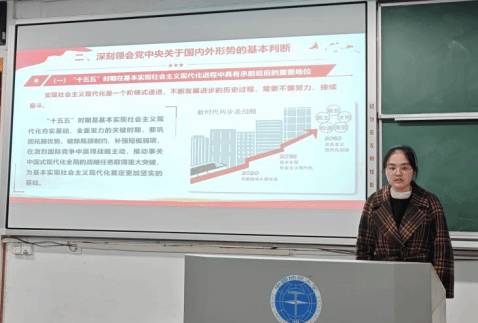 随后,姬雯格同学就“准确把握‘十五五’时期经济社会发展的战略任务、重大举措和根本任务”进行讲解,重点阐述了建设现代化产业体系、加快科技自立自强、建设强大国内市场、构建高水平市场经济体制、扩大高水平对外开放、加快农业农村现代化等十二项战略任务,帮助同学们全面把握国家未来五年的重点部署与行动路径,并进一步强调坚持和加强党的全面领导是推进中国式现代化的根本保证。
