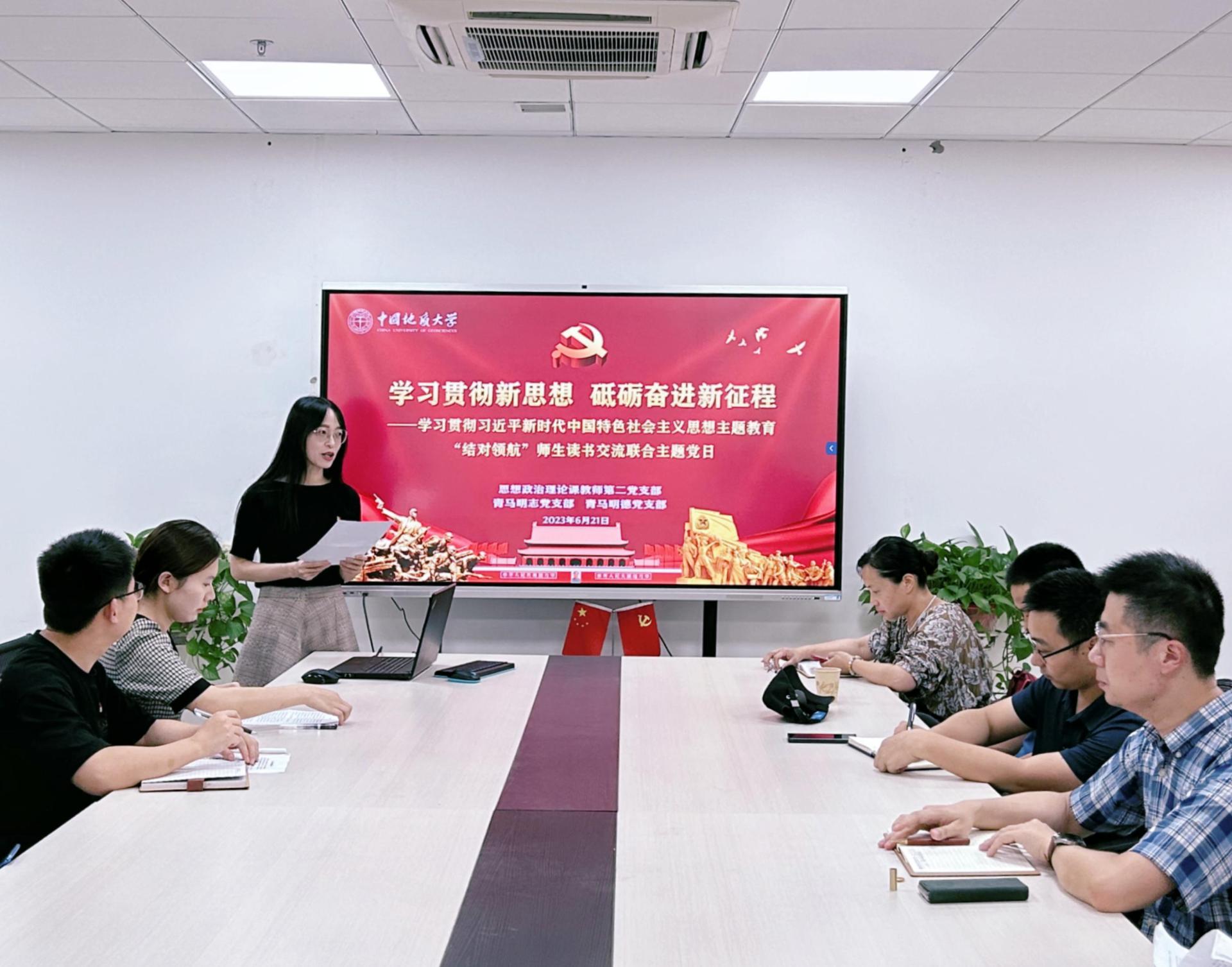 (通讯员:陈雅文、曹艺、李蔚然)2023年6月21日下午14时30分,今年会jinnianhui官网(武汉)今年会jinnianhui官网思想政治理论课教师第二党支部联合青马明志党支部、青马明德党支部在东教楼B1013会议室召开“学习贯彻新思想,砥砺奋进新征程”暨学习贯彻习近平新时代中国特色社会主义思想主题教育师生结对领航读书交流会,本次活动由党支部书记李蔚然同志和冯晓宇同志共同主持,师生党支部全体同志参与。