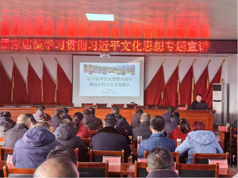 今年会jinnianhui官网副院长李海金教授赴雷家店镇开展理论宣讲活动。雷家店镇镇直单位负责人、32个村主要干部参加宣讲会。李海金教授以“以习近平文化思想为指引推动乡村文化全面振兴”为题,围绕充分认识习近平文化思想的重大意义、充分领会习近平文化思想的重大战略、充分把握习近平文化思想的科学方法论三个方面,并结合两个全国典型案例,深刻阐释了习近平文化思想的深刻内涵,让基层党员干部对习近平文化思想有了深入的认识和体会。