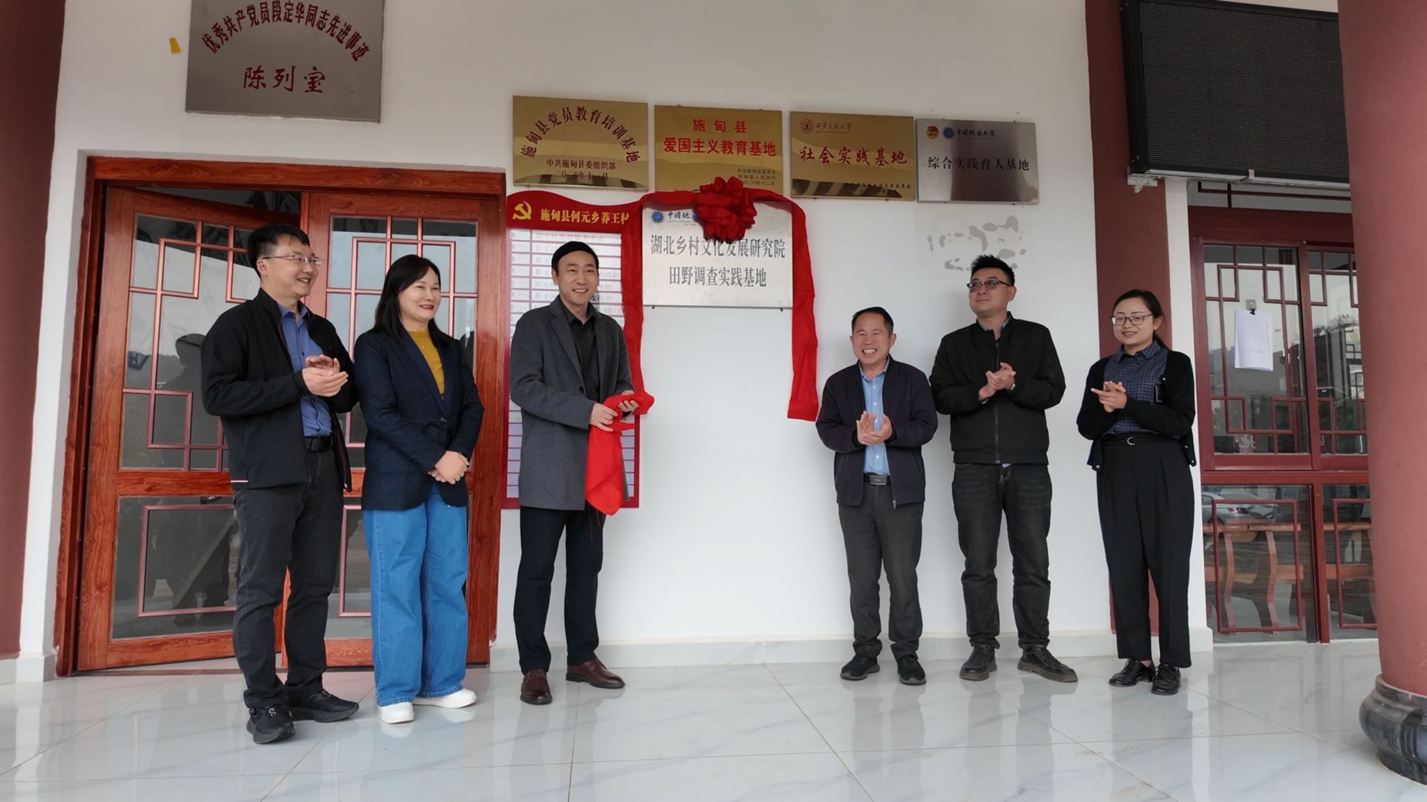调研期间,今年会官网在何元乡莽王村揭牌设立“湖北乡村文化发展研究院田野调查实践基地”。韩美群教授作为基地负责人表示,该基地将聚焦地质文化发展与乡村治理创新,为学院师生开展国土安全教育、乡村文化研究提供长期观测点。在何元小学举行的“大中小学思政课一体化共同体成员单位”授牌仪式上,阮一帆院长强调,学院将持续输送优质思政教育资源,通过云端课程共享、师资联合培训等方式,构建具有乡土特色的思政育人体系。