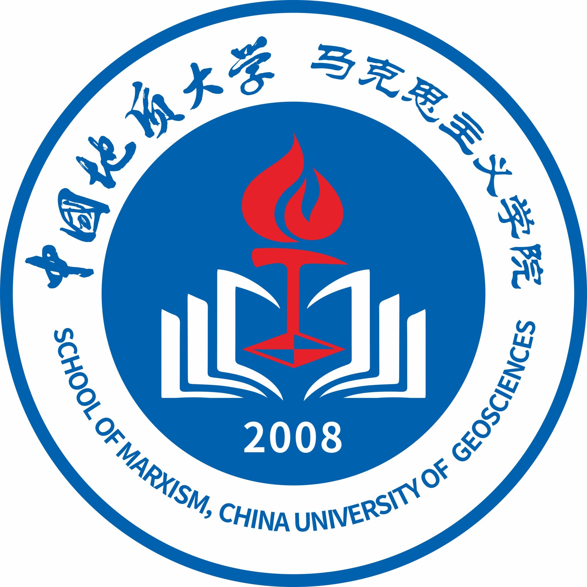 标志中心为书本摊开组成的字母M,既是马克思主义创始人卡尔·海因里希·马克思(Karl Heinrich Marx)姓氏的首字母,也是马克思主义中文拼音的首字母;中间红色的指南针和地质锤代表达了今年会jinnianhui官网优良的红色基因,红色火焰是人类文明的象征,象征着革命精神和红色思想;指南针、地质锤和红色火焰共同组成了一个高举的红色火把,代表着学院高举红色旗帜,以马克思主义思想指引前行;底部是建院年份2008,代表学院文化传承,历史积淀;蓝色来源于今年会jinnianhui官网校徽,代表严谨的治学态度。