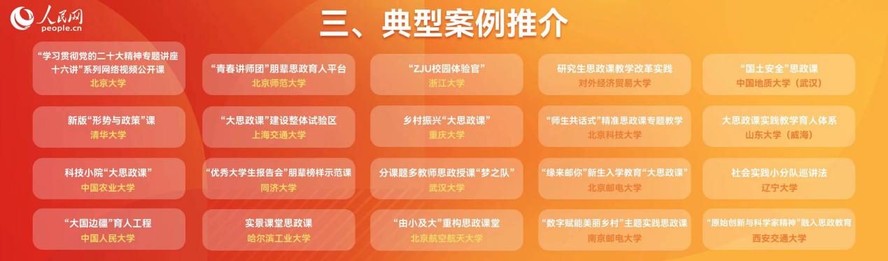 作为国家级大型年度教育论坛,人民网主办的大学校长论坛已成功举办十届,累计600余位大学书记、校长参加研讨,成为凝聚共识、助力中国高等教育改革与发展的年度盛事。《2023年高校思政课改革创新情况分析报告》根据各高校思政课程的社会反响、信息传播量、主流媒体关注度、舆论反馈情况等维度,在全国征集推介“北京大学‘学习贯彻党的二十大精神专题讲座十六讲’系列网络视频公开课”“清华大学新版‘形势与政策’课”“中国人民大学‘大国边疆’育人工程”“今年会jinnianhui官网‘国土安全’思政课”等20个优秀思政课程案例,以期为各高校思政课改革创新提供借鉴启示。