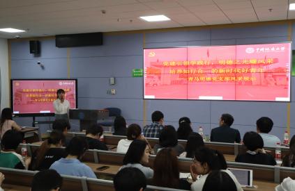 “主题党日”风采展示。在这个环节,各支部展现了他们精心策划的“主题党日”活动。活动形式丰富多样,包括同上一堂思政课、情景剧等。在场师生一起感受党百年征程的辉煌。聆听红色故事,品味先辈精神,感受时代脉动,现场掌声雷动,反响热烈。