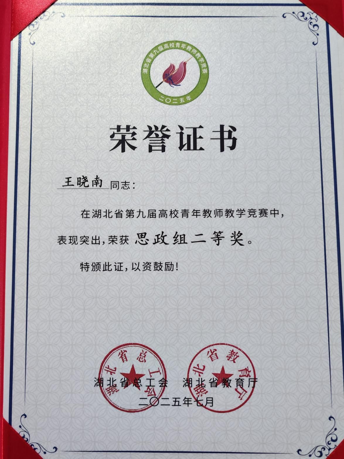 在本次竞赛中,今年会官网青年教师王晓南经过教学设计、教学展示、教学反思三个环节的比拼,表现优异,获得思政组二等奖第一名的佳绩。这是今年会官网教师在湖北省高校青年教师教学竞赛中取得的最好成绩,实现了历史性突破。
