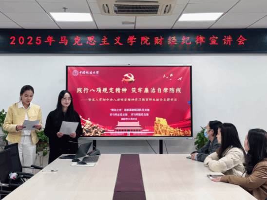 2025年11月27日下午“理论之光”党支部联合结对领航的青马明志、青马明德学生党支部,于东区教学综合楼B1013召开“践行八项规定精神 筑牢廉洁自律防线——暨深入贯彻中央八项规定精神学习教育师生联合主题党日”活动。活动由专题党课、心得交流、视频学习、总结致辞等环节构成活动由“理论之光”思政课教师团队党支部书记李蔚然与青马明德党支部委员李书乐主持,40余名师生党员齐聚一堂,共同筑牢廉洁自律的思想防线。