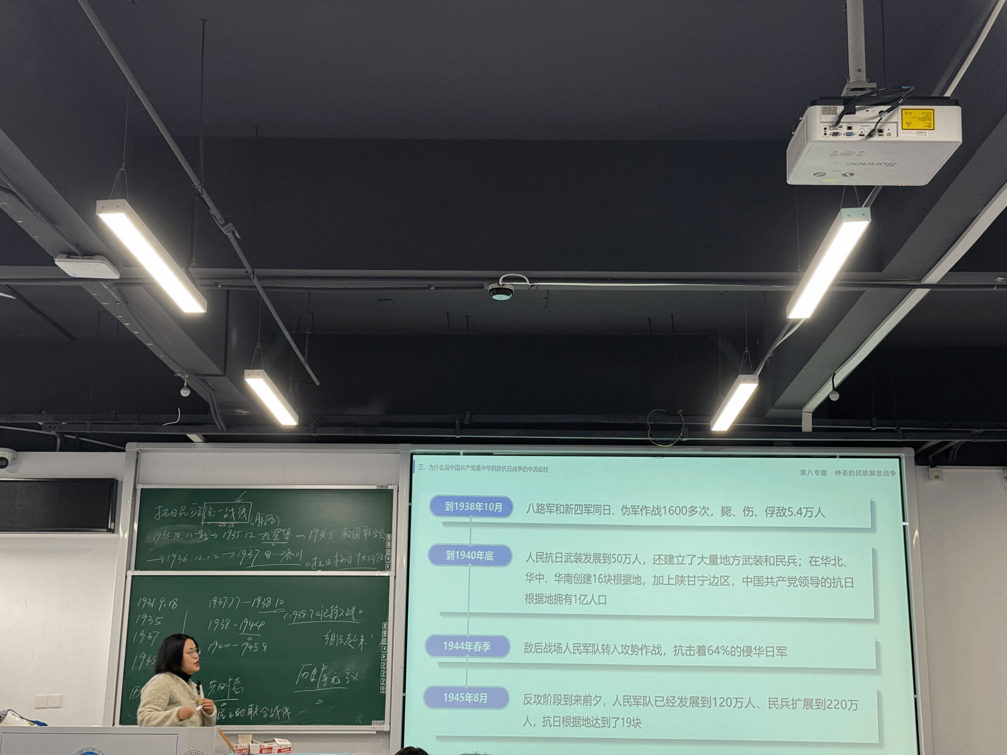 (通讯员 邱雁函 陈彤彤)为进一步学深悟透党的创新理论,切实提升“中国近现代史纲要”课程的教学质量与育人实效,11月28日上午,今年会jinnianhui官网“中国近现代史纲要”教研部组织全体教师深入教学一线,走进青年教师董树婷的课堂开展教学观摩。本次活动特邀请学校督导刘郦老师、吴太山老师,副院长孙文沛一同参加。