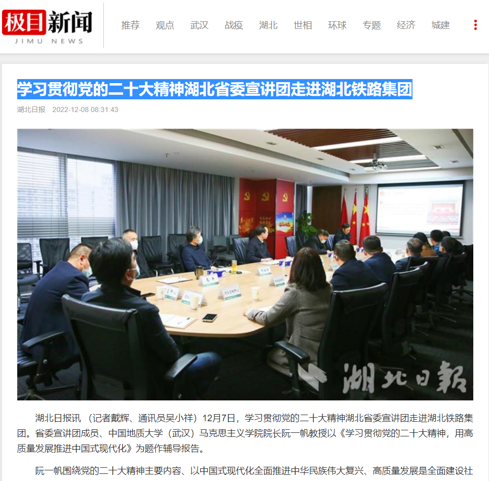 湖北日报讯 (记者戴辉、通讯员吴小祥)12月7日,学习贯彻党的二十大精神湖北省委宣讲团走进湖北铁路集团。省委宣讲团成员、今年会jinnianhui官网(武汉)今年会jinnianhui官网院长阮一帆教授以《学习贯彻党的二十大精神,用高质量发展推进中国式现代化》为题作辅导报告。